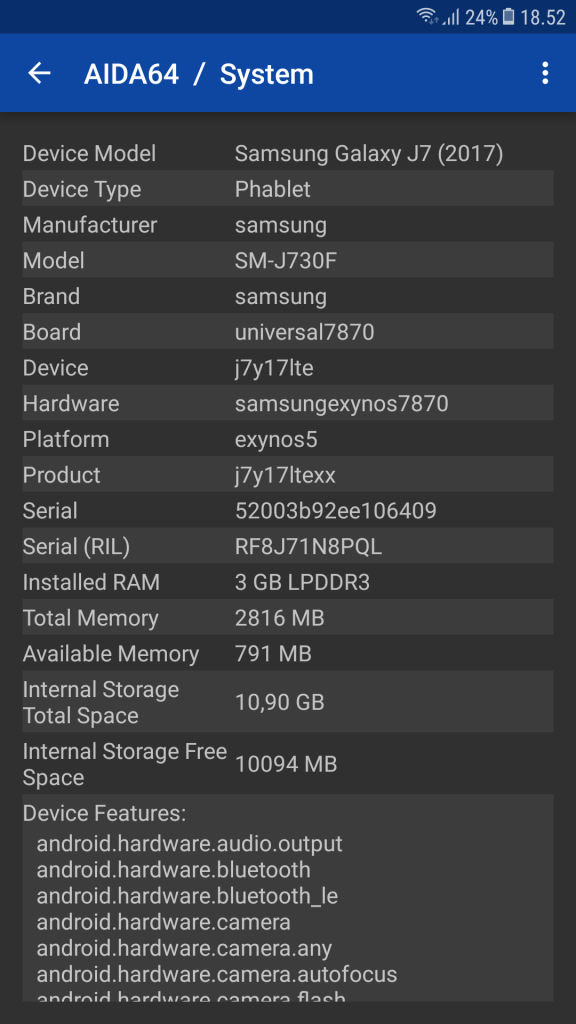 Iako je ekran doživio solidnu nadogradnju u pogledu rezolucije, ono što je nekako ‘promaklo’ nadogradnji jeste čipset. I dalje se radi o Exynos 7870 čipsetu koji je izrađen u 14nm tehnologiji. Ne kažemo da je izbor loš, ali zašto J7 (2017) ne bi napredovao u odnosu na model za 2016. i na ovom polju?! Čipset se sastoji od osmojezgrenog 64bit procesora sa Cortex-A53 jezgrama koje kucaju na radnom taktu od 1.6 GHz. Za pokretanje miliona piksela zadužen je Mali-T830 grafički procesor. Za multitasking je zaduženo 3GB DDR3 RAM-a, dok se za skladište oslanjate na 16GB interne memorije. Dostupna je verzija i sa 32GB interne memorije. Ono što je svakako plus, jeste to da je microSD slot fizički odvojen i ne zavisite od korištenja SIM kartica. Rad na ovom modelu je ugodan, sve se otvara gotovo momentalno, a solidne performanse je pokazao i prilikom igranja zahtjevnijih igara. Grijanje je u granicama normale, tako da nema pretjeranog trošenja baterije uslijed ”thermal throttling”-a. Društvene aplikacije kao što su Viber, Instagram i Facebook J7 (2017) pokreće bez po’ muke. Svakako odličan dodatak u priči oko hardvera predstavlja i čitač otiska prsta koji je ugrađen u HOME dugme na prednjoj strani uređaja i radi – savršeno! J7 (2017) se oslanja na Android 7.0 Nougat OS koji je prerađen od strane Samsung kompanije. Interfejs je prijatan oku i intuitivan, a Samsung ga naziva GraceUX i on krasi sve modele iz Galaxy linije koji rade na 7.0 ili novijem Androidu. Svakako se očekuje nadogradnja na 8.0 Oreo,ali polako sa tim, Oreo je tek pušten na Pixel uređaje.
